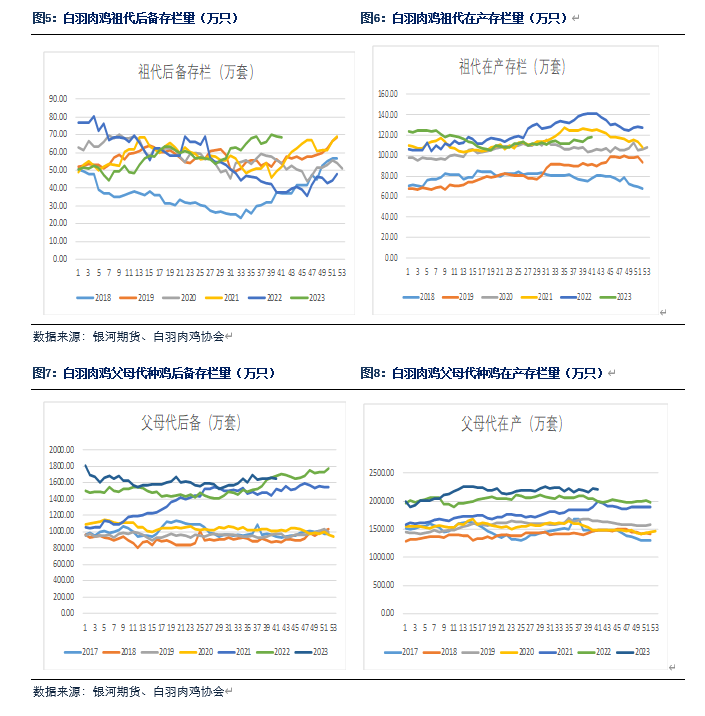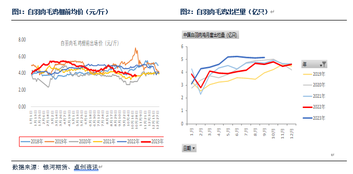 2023年10月分割品消费低于预期,毛鸡价格跌至年内新低。截至10月27日,白羽肉鸡棚前成交均价3.66元/斤,较上月跌5.1%,同比去年跌21.8%,其中山东棚前收购价3.7元/斤。山东白羽肉鸡从10月初的3.9元/斤下跌到10月中旬的3.5元/斤,创下年内新低,然后下旬反弹到月底的3.7元/斤。上半月白羽肉鸡下跌的逻辑:1、节后下游消费低迷,屠宰企业库容率较高,分割品价格持续下跌,屠宰企业下压毛鸡价格。2、毛鸡供应供应充足,部分地区供应过剩。但下旬毛鸡价格跌到年内新低后,开始企稳反弹,主要原因是:终端分割品库容率持续下滑,价格开始企稳,毛鸡供应开始减少,经销商出现抄底,屠宰企业开工率上涨,支撑毛鸡价格。由于毛鸡供应仍在下跌,养殖企业持续亏损,毛鸡价格底部抬升,预计11月毛鸡价格在3.6-4.2元/斤,11月低点要高于10月低点的3.5元/斤,毛鸡价格会持续走高。