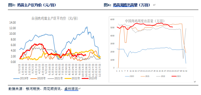 出苗量方面,10月肉鸡出苗量继续下滑。根据卓创25家大型孵化企业数据,10月鸡苗出苗量低于9月,前4周出苗量为20593.94万羽,每周出苗均在下滑。部分原因是养殖利润亏损较大,鸡苗价格较低,出苗量减少,同时10月是淡季。但11月预计养殖利润会转好,毛鸡和鸡苗价格会偏强,出苗量会高于10月。