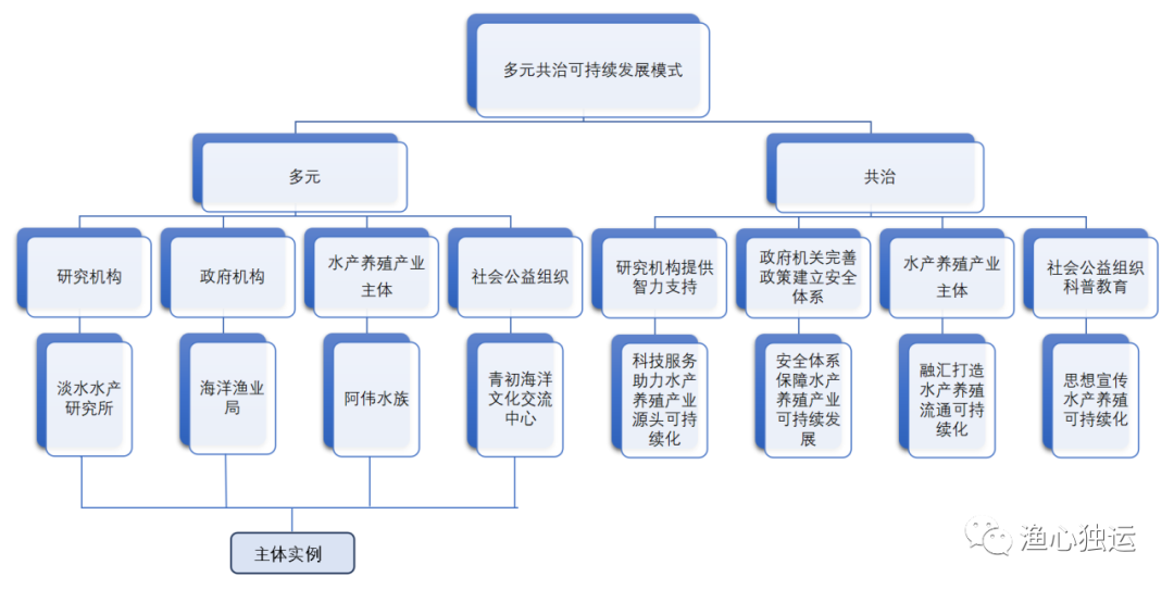 何为共治?唯有集合五元力量,才可以实现可持续发展。多元共治模式充分调动水产养殖产业五大主要参与主体,研究机构通过科技服务助力水产养殖产业源头的可持续化;政府机关通过完善政策制度保障水产养殖产业可持续化;渔民渔村渔企通过加强合作促进水产养殖产业流通的可持续化;社会公益组织则从思想助力水产养殖产业可持续化。