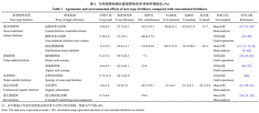值得注意的是,新型肥料实现其最佳增产减排效应依赖合理的施用方法。例如,抑制剂型缓释肥料能够减少氮素的氨挥发和氧化亚氮排放损失,但Fan等、Li等和Xia等研究认为,添加硝化抑制剂的肥料促进了9%~29%的氨挥发。因此,新型肥料施用不当也存在降低作物产量或促进土壤养分环境损失的风险。因此,需要研究不同作物、土壤、气候条件下新型肥料适宜的产品,有针对性地进行肥料增效技术的改良创新。