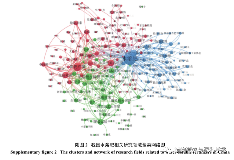 水溶肥泛指全部成分可溶于水的复合肥,可以全部是氮磷钾化肥或中微量元素肥料,也可以是含水溶性有机小分子的肥料。水溶肥是水肥一体化技术不可或缺的肥料类型,全球水溶性肥料总消费量约为800万t,在发达国家主要用于大田作物、园林景观绿化植物和高尔夫球场的灌溉施肥及叶面施肥等。水肥一体技术最成熟、应用面积最大的是美国,水溶肥达到化肥市场总量的40%,美国25%的玉米、60%的马铃薯、33%的果树均应用了水肥一体化技术,而以色列由于缺水是水溶肥和水肥一体技术利用率最高的国家,90%以上的农田采用灌溉施肥,温室作物全部采用灌溉施肥系统。我国水溶肥产业起步于20世纪80年代中后期,其发展历程主要分为3个阶段:1)初步形成阶段,以溶解性及配伍性好的无机盐类为原料配制叶面肥,养分种类少、浓度低、应用效果不稳定;2)初步发展阶段,随着对叶面营养机理研究深入,叶面肥产品中开始添加中微量元素及螯合剂和表面活性剂等助剂,养分种类、养分浓度和吸收效率得到较大提升。由于节水灌溉施肥技术发展滞后,水溶肥产业发展较为缓慢;3)快速发展阶段,随着喷灌、滴灌和无土栽培等技术的快速发展,带动了水溶肥料的生产。在水溶肥中加入氨基酸、腐殖酸、海藻酸等有机活性物质,水溶肥功能走向多元化。从近20年水溶肥相关研究的关键词聚类网络图(附图2)也可以看出,我国的水溶肥研究中大量元素水溶肥、中微量元素水溶肥、氨基酸水溶肥、腐殖酸水溶肥以及有机水溶肥各领千秋。张从军等利用粗磷酸螯合处理形成的磷酸一铵溶液,与尿素、氯化钾、硫酸镁溶液以及腐殖酸溶液等配伍,制备了含海藻酸提取物的大量元素全水溶性液体肥料。豆亚妮等利用微生物发酵技术从糠醛渣中提取腐殖酸,通过与大量、中量、微量元素化合物进行鳌合,制成螯合态腐殖酸水溶肥。随着我国各类水溶肥料产品及其检测标准陆续颁布,水溶肥料登记产品数量快速增加,水溶肥相关专利申请达3148项。据中国化工信息中心统计,我国水溶肥料年产量约410万t,水溶肥及水肥一体技术的推广应用面积约1000万hm2 (1.5亿亩),主要应用于西北的棉花、玉米和马铃薯,华北的蔬菜、玉米和小麦,西南的马铃薯、蔬菜和水果等作物上。在水溶肥生产工艺技术上,突破了磷酸氨化过程复合螯合和固体肥料级聚磷酸铵(APP)聚合分布可控制备与工艺,创制了原位螯合水溶性磷酸一铵和肥料级固体APP等产品,具有成本低、溶解度高、螯合能力强、配伍性好等特点。虽然在国内高端水溶肥市场中,来自以色列、美国等国的进口产品仍占据较高的市场份额,但随着我国水溶肥和水肥一体技术的持续推进,进口水溶肥市场占有率正在逐步减少。