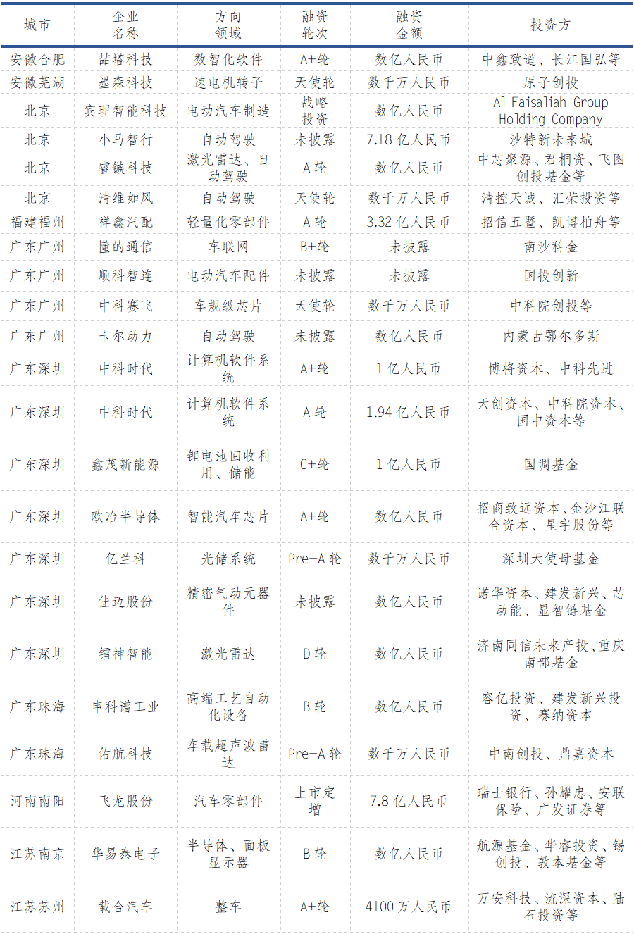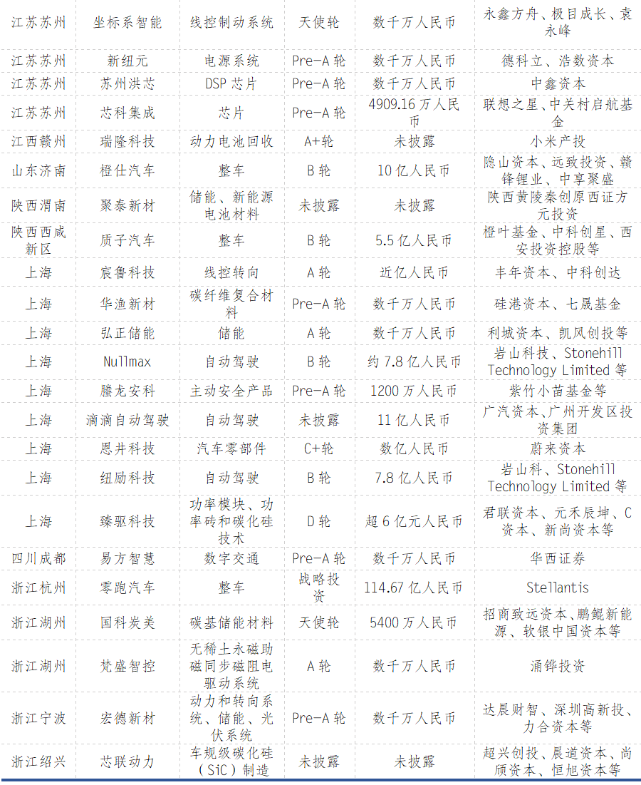 从融资轮次来看,Pre-A轮融资事件数目位列第一,达到9起,但多数Pre-A轮融资金额未披露。从已披露的融资金额来看,战略融资轮融资金额最高,且该轮仅有零跑汽车一家企业披露,融资金额约为114.7亿人民币,占比达61.5%。