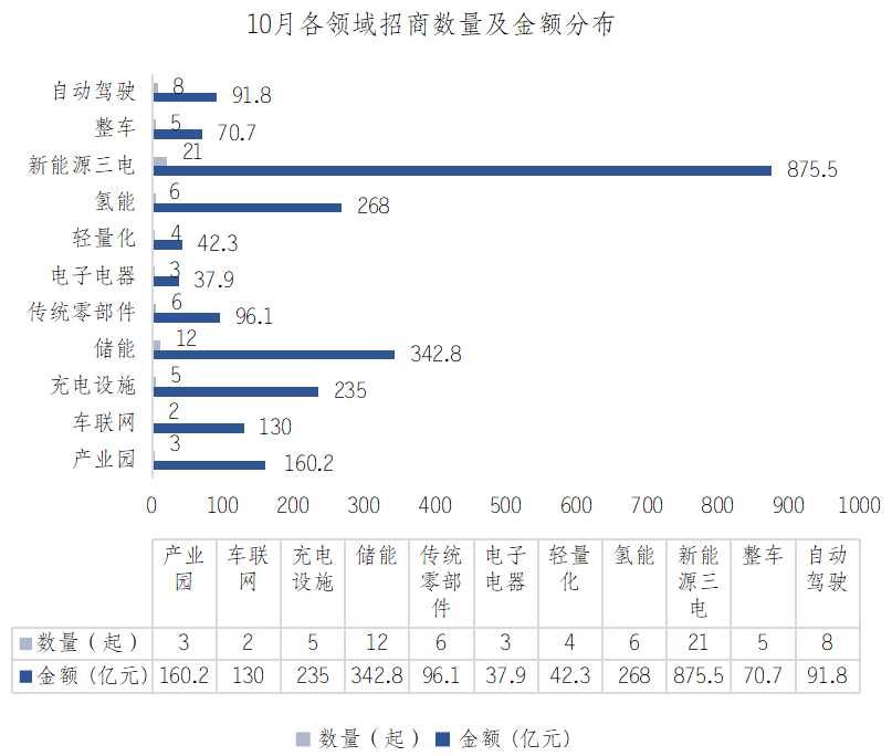 从招商领域分布来看,10月新能源三电领域最为突出,金额超过875.5亿元,占招商总额的37.2%,其次为储能领域,金额342.8亿元,占比14.9%。