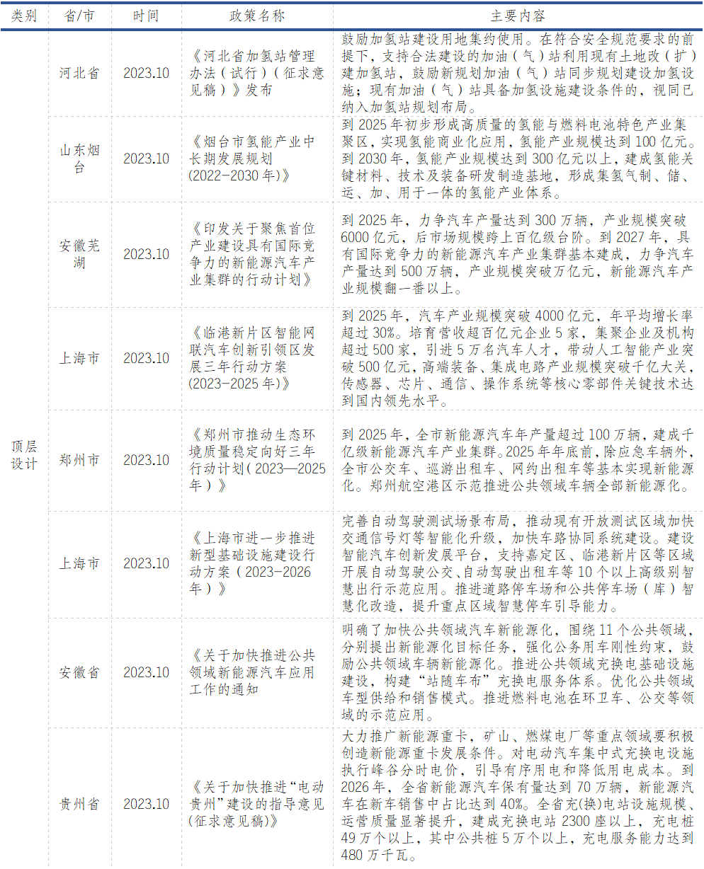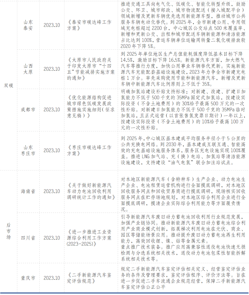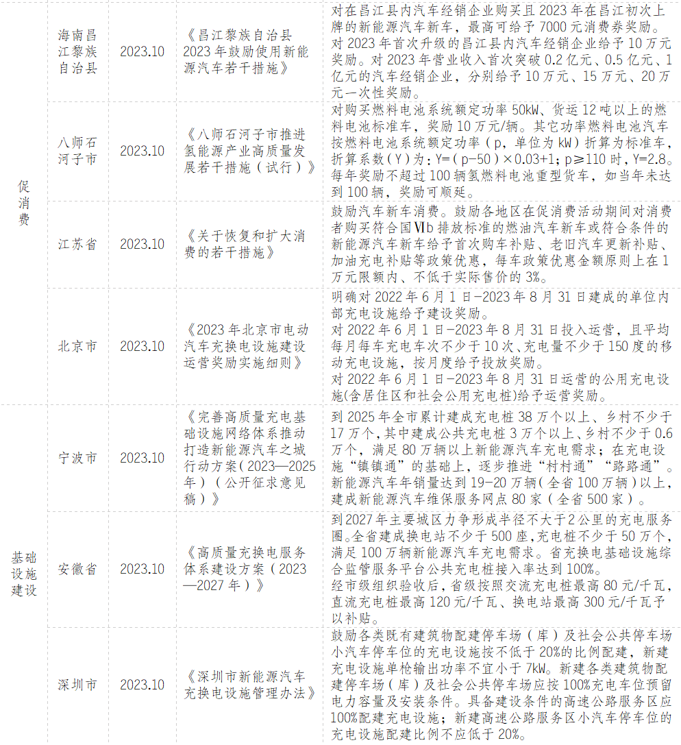 2023年10月,地方政策聚焦汽车高质量发展,从顶层设计、促消费、基础设施建设、双碳以及后市场等多方面为行业健康发展保驾护航。河北、山东、安徽、河南等地纷纷出台顶层设计为新能源汽车行业谋篇布局;海南、新疆、江苏、北京等省市出台一系列政策促进新能源汽车消费;浙江、安徽、深圳等地保障基础设施建设;山东、山西、成都等城市多措并举助力双碳战略实施;海南、四川、重庆等地多方发力加强汽车后市场建设。