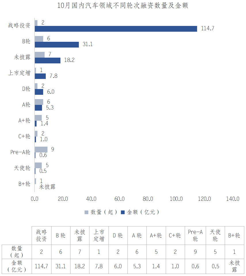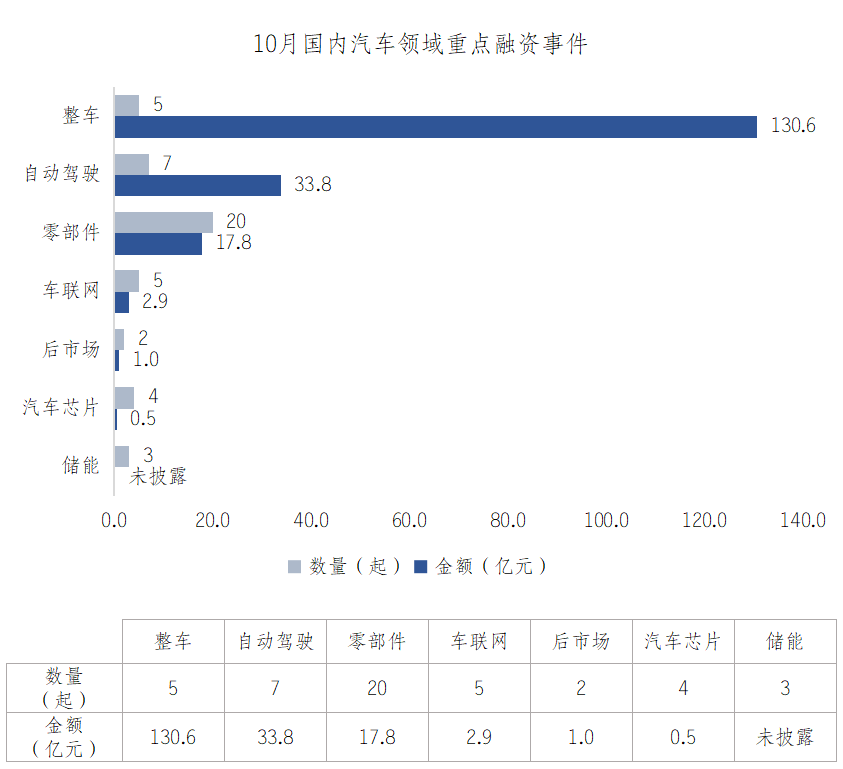 从投资事件数量来看,10月汽车零部件领域最为活跃,共有20起融资;从已披露投资金额来看,整车领域的融资总额最多,约为130.6亿元,占比超过69%。零跑汽车获得114.7亿人民币战略融资,为10月汽车领域单笔融资数额最大融资事件。