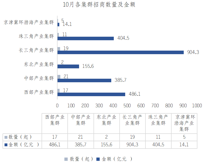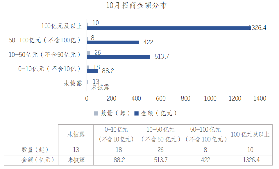 从招商金额分布来看,10月招商金额累计超2350亿元,单笔投资金额超过百亿元的项目有10起,合计招商金额1326.4亿元,占本月招商总额的56.4%。
