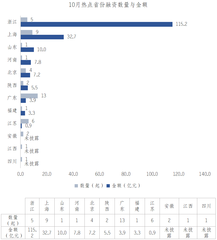 从融资地区来看,10月融资数量排名前三的地区分别是广东(13起)、上海(9起)和江苏(6起)。从已披露的融资金额来看,浙江和上海两地金额总额约为147.9亿元,占比79.3%。从单个省份来看,广东13家公司获投,数量最多,但多数公司融资金额未披露,已披露的融资金额仅为3.9亿元。