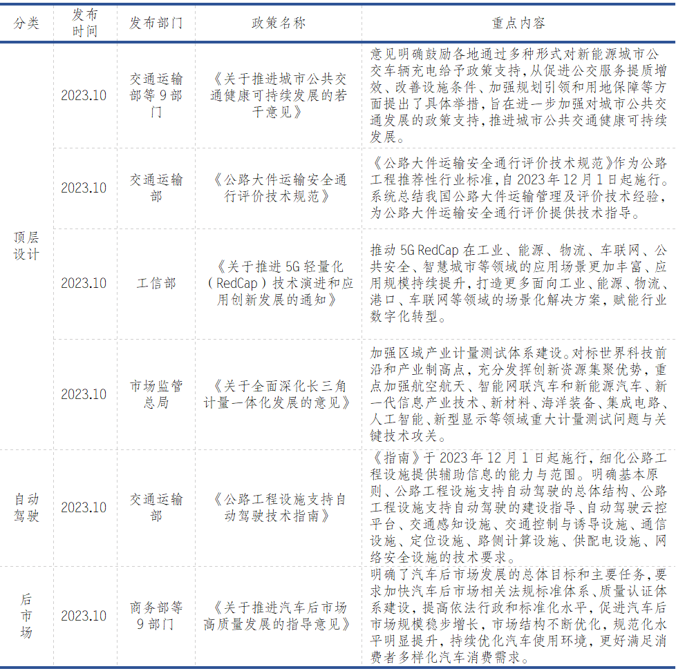 2023年10月,国家政策重点聚焦汽车行业高质量可持续健康发展,发布城市公共交通健康可持续发展的若干意见、推进5G轻量化(RedCap)技术演进和应用创新发展、推动汽车后市场高质量发展等政策文件,多措并举保障汽车行业行稳致远。