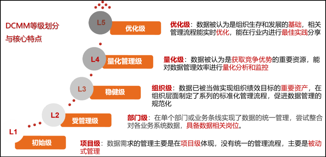 数据管理能力成熟度分五级,自低向高依次为初始级(1级)、受管理级(2级)、稳健级(3级)、量化管理级(4级)和优化级(5级)。