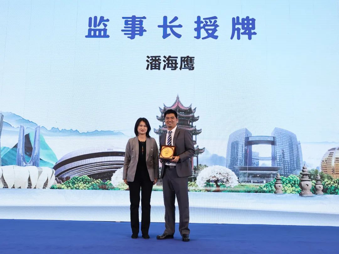 市委统战部副部长、工商联党组书记潘海鹰为浦籍企业家、监事长洪森伟授牌