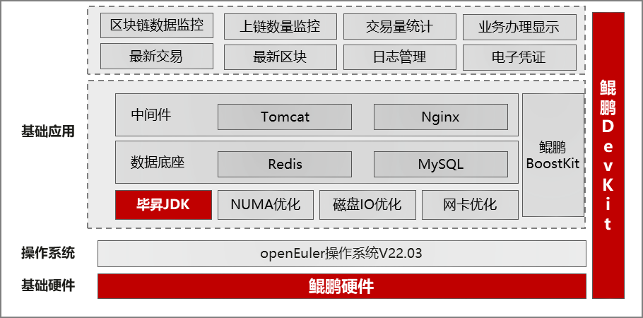 鲲鹏天然的多核高并发、高安全等优势,能够很好的满足平台低时延、高可用等要求,并提供完善的鲲鹏DevKit开发套件以及专业服务,能够帮助用户快速完成应用的迁移、开发、编译和调优;基于以上考虑,研究所与鲲鹏达成了深度合作,基于鲲鹏软硬件平台,共同打造区块链政务服务协同数据治理平台 V1.0,为用户提供更安全、高效、全面的数据保护。