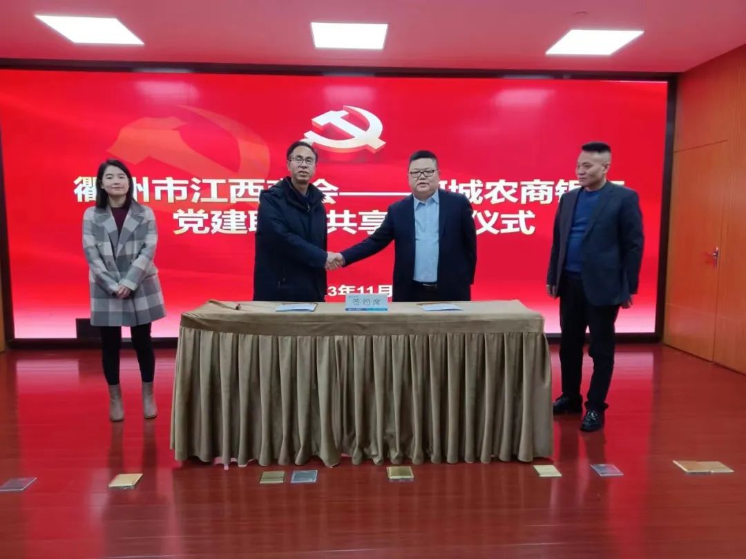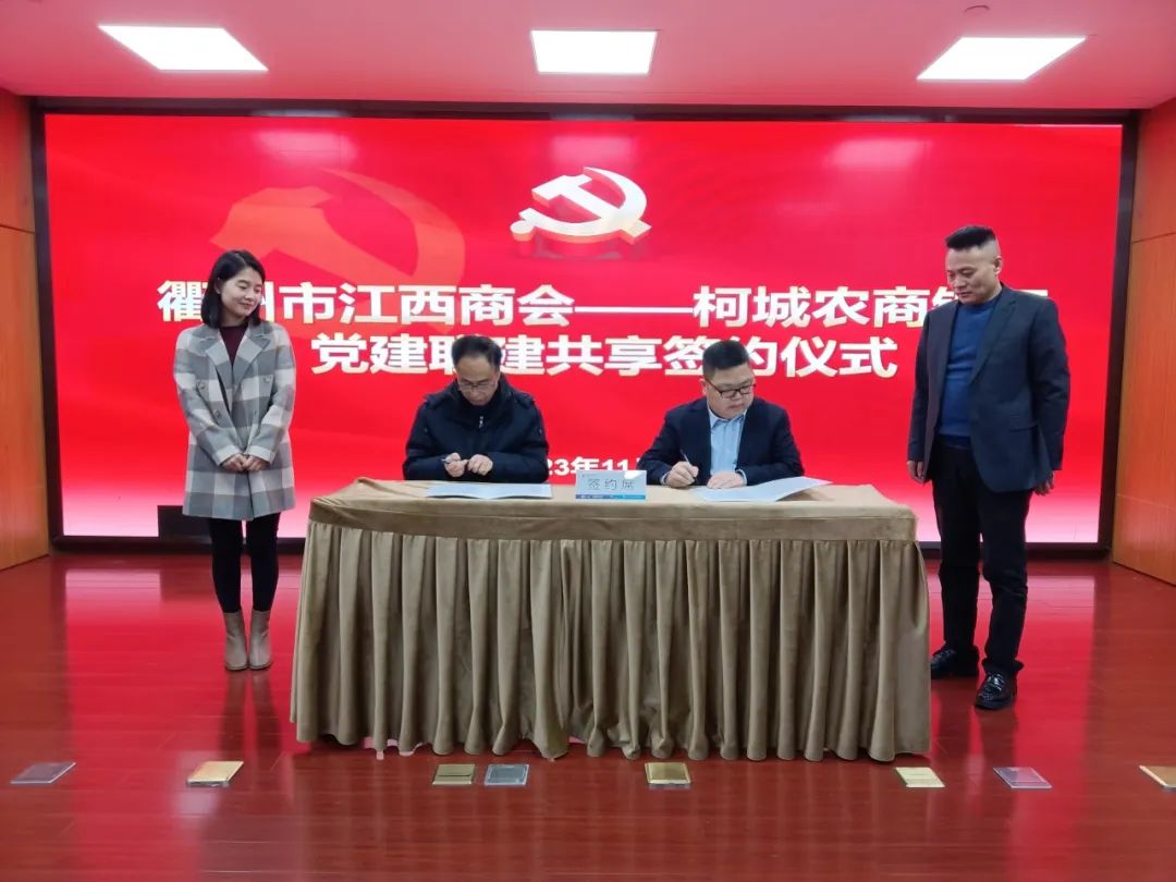本次会议得到了柯城农商行的大力支持,现场,大家共同见证了中共衢州市江西商会支部委员会书记林遗良与柯城农商银行双港支行支部委员会书记何五根签订党建共建活动协议。签到仪式上,詹红炉会长表示,这是企业与金融机构共建共联的一次有益探索,让企业了解金融政策,为企业融资提供便利,得到更好的金融支持。何五根行长就共建活动工作及银行帮扶企业具体措施进行说明。