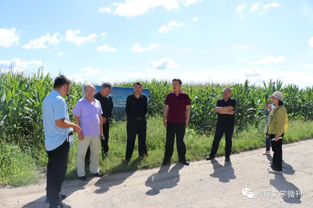 听完孙会长对商会做完介绍,我们驱车前往大田示范区。不久,在一片长势茂盛的玉米地的路边停下,一块醒目蓝色大牌矗立在地头,牌上一行红字——高产高效玉米密植高产千亩示范区。