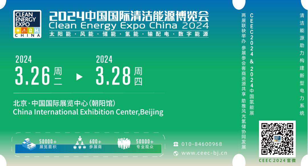 2024中国国际清洁能源博览会(英文:Clean Energy Expo China,简称“CEEC2024”,以下简称“博览会”)定于2024年3月26日至28日在北京中国国际展览中心(朝阳馆)举办。博览会由中国电力企业联合会和国家能源集团牵头,联合中国光伏行业协会、中国机电产品进出口商会、中国产业海外发展协会、中国氢能联盟、中国国际贸易促进委员会建设行业分会等单位主办,中国国际贸易促进委员会电力行业委员会、北京泰格尔展览有限公司承办。 据悉,中国国际清洁能源博览会始于2009年,已成功举办十三届,是我国率先专注于清洁能源装备产业链的多类别专业博览会,目前已发展成为政府部门了解清洁能源行业发展、国内外清洁能源产业交流与合作、电力央(国)企新能源设备选型和集中采购、社会大众了解清洁能源发展现状和未来风向的首选平台。