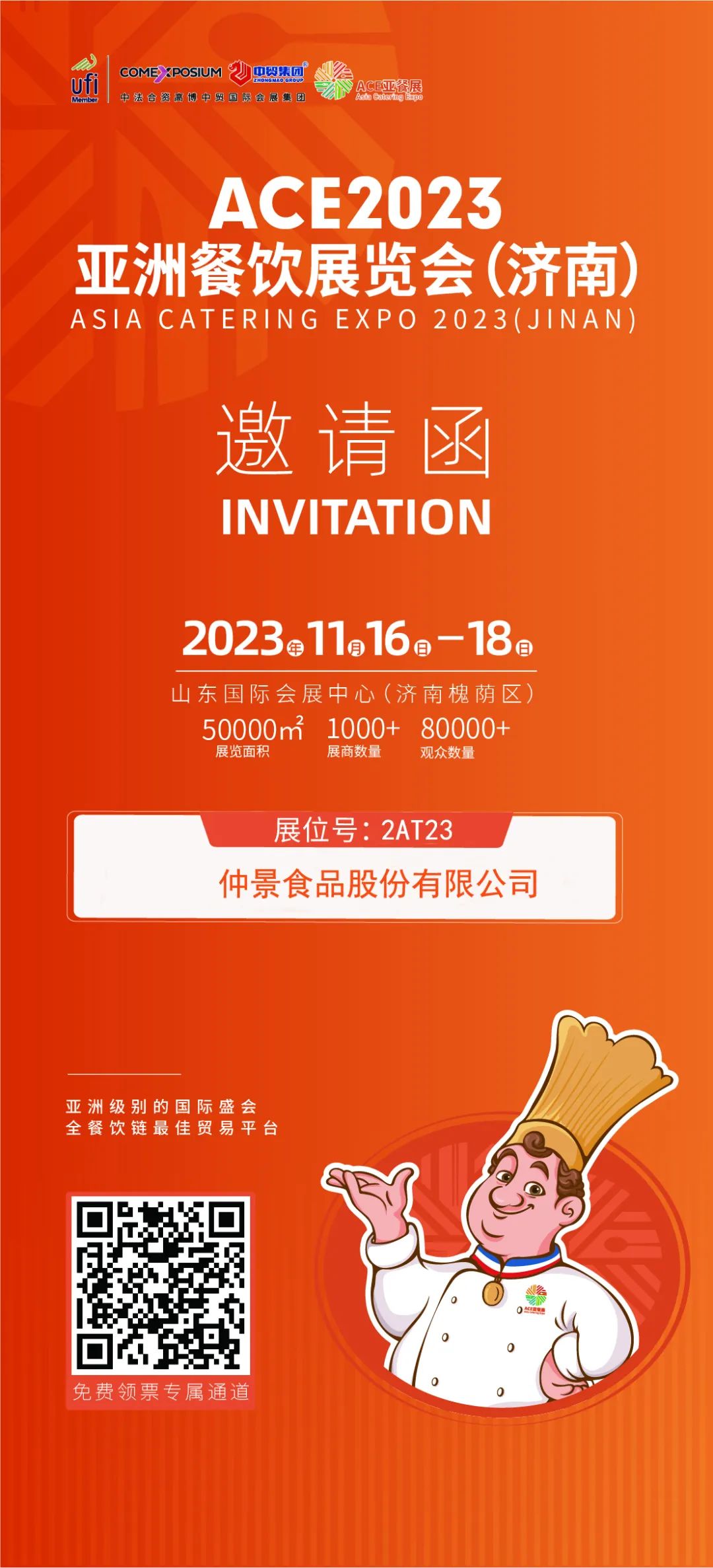 11月16日至11月18日,ACE2023亚洲餐饮展览会(济南)参展单位,仲景食品股份有限公司将在 2AT23 展厅展出,敬请期待!