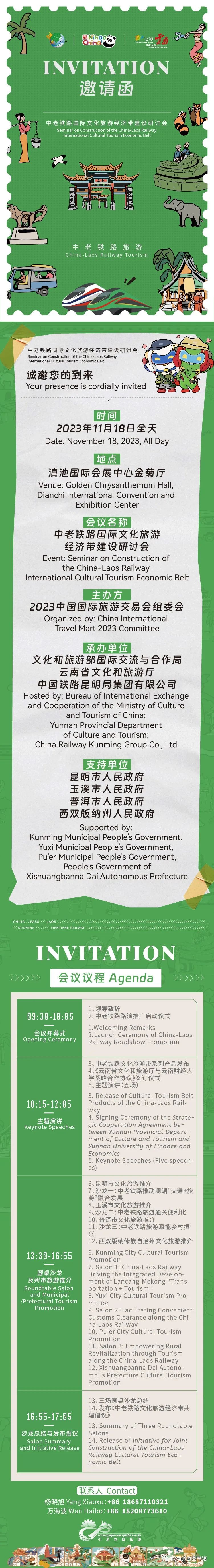 2023中国国际旅游交易会期间,中老铁路国际文化旅游经济带建设研讨会将于11月18日全天,在滇池国际会展中心7号馆二楼金菊厅举行,诚邀各位参会。来宾请提前与联系人预约报名,当日持身份证安检入场。