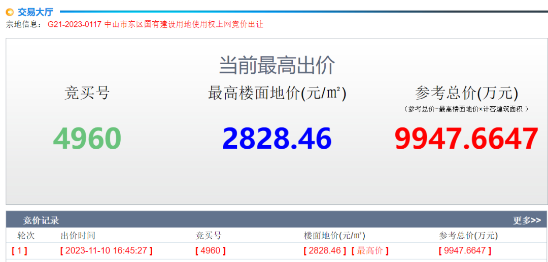 早在11月10日,竞买号【4960】就已经开始出价,直至11月15日限时竞价阶段,再无其它开发商出价。