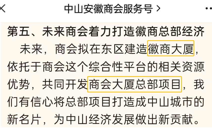 同年10月,中山市安徽商会举办第四届第一次会员(换届)大会时,也特别提到,拟在东区建造徽商大厦,将总部项目打造成中山城市新名片!