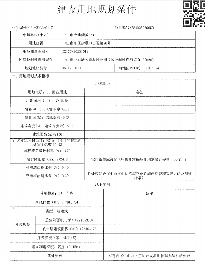 规划指标:1≤容积率≤4.5,建筑密度≤50%,绿地率≥25%,建筑限高≤100m,7815.54≤计容建筑面积≤35169.93㎡。