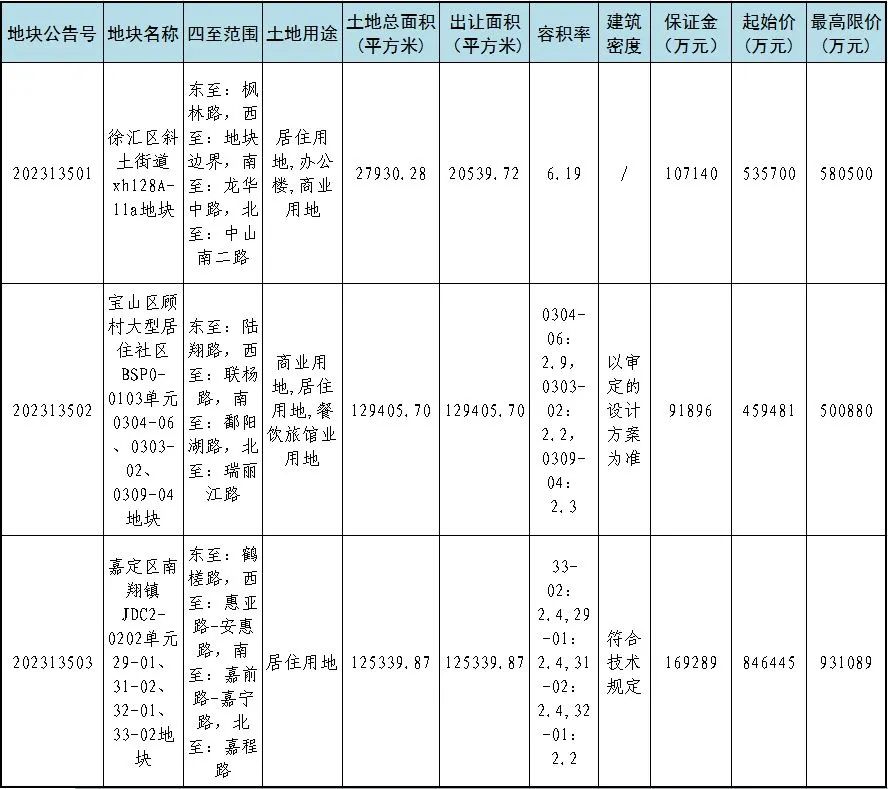 根据国家有关法律、法规和《招标拍卖挂牌出让国有建设用地使用权规定》、《上海市土地使用权出让办法》等规定,发布涉及徐汇区、宝山区、嘉定区3个地区共计3幅国有建设用地使用权。有关情况公告如下:
