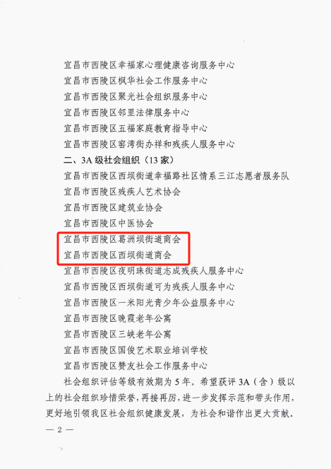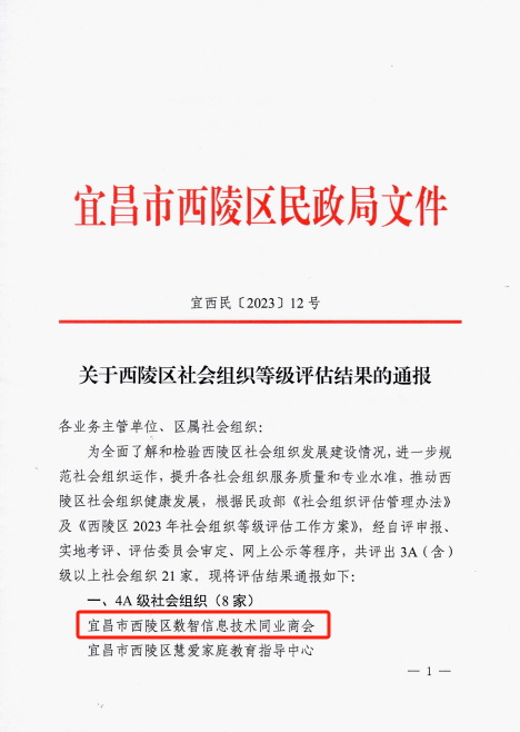 2023年11月7日,西陵区民政局公布2023年度区属社会组织等级评估结果通报。经评定,区工商联直属管理的区数智信息技术同业商会荣获4A级社会组织,西陵西坝街道商会、西陵葛洲坝街道商会荣获3A级社会组织。