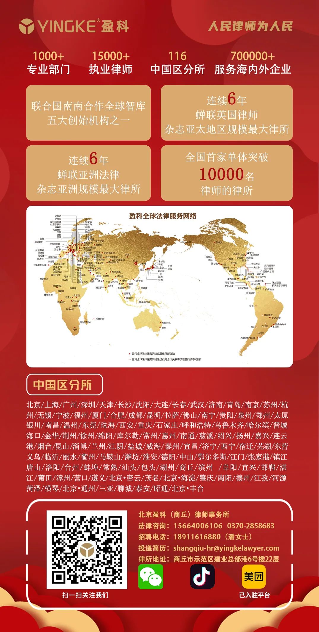 北京市盈科律师事务所是一家全球化法律服务机构,提供全球一站式商务法律服务,在中国区拥有116家分所;在2022 Global 200全球律师人数排名中位列第一,已成为全球最大律师事务所,汇聚大量国内国际优秀法律人才。盈科全球法律服务网络覆盖97个国家的167个国际城市。依托盈科全球化法律服务机构的平台优势,盈科商丘律所整合资源,为客户解决法律纠纷,提供商业机会,促成交易,创造价值。
