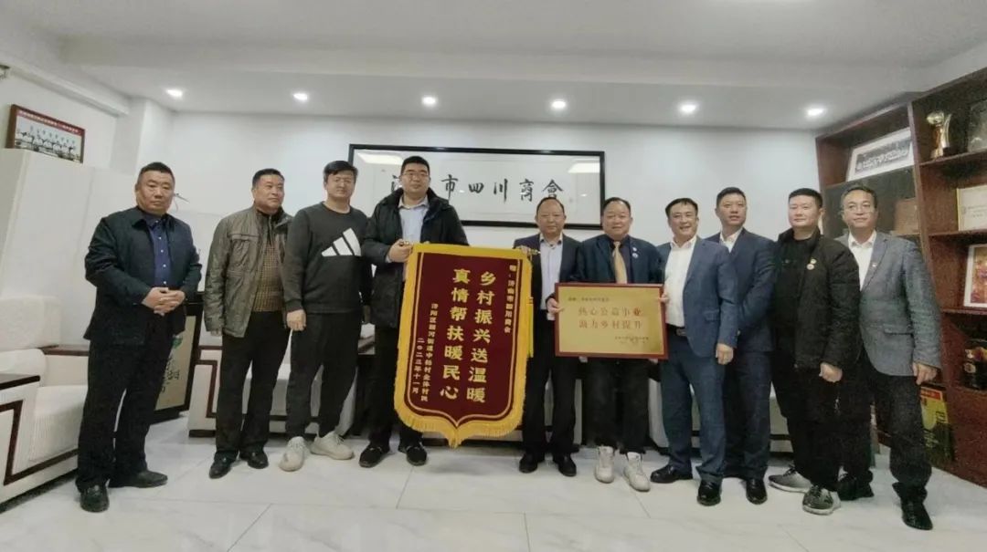 11月14日,济阳区回河街道党工委委员、综合执法办公室副主任韩宁、济南市工商联派驻中杨村第一书记范国辉及沟杨管区、中杨村负责人一行到历城区华龙路新龙商务中心,将镌写有“热心公益事业,助力乡村提升”的烫金牌匾和写有“乡村振兴送温暖,真情帮扶暖民心”的锦旗赠送给济南市四川商会,感谢他们为回河街道中杨村的池塘防护整理和提升打造工程所做的公益建设。