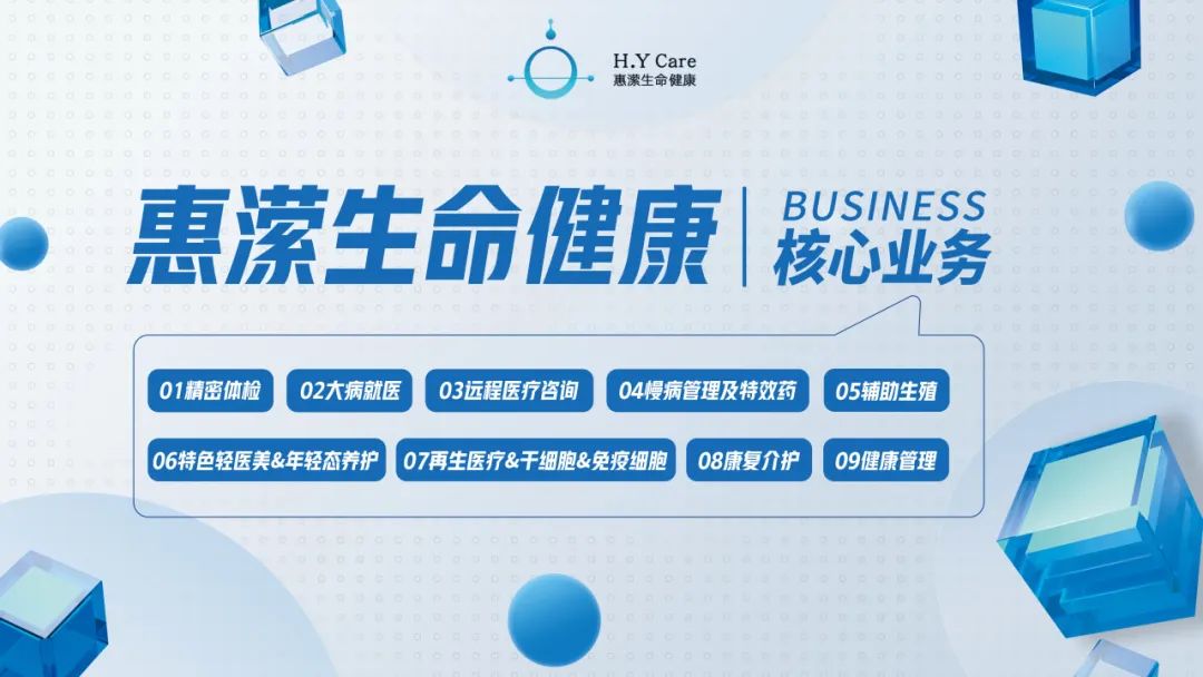 包括大病医疗、精密体检、年轻态养护、细胞治疗、特色轻医美、辅助生殖、远程医疗咨询、康复介护等全生命周期服务,满足中高端客户追求优质医疗服务的需求,塑造健康未来。