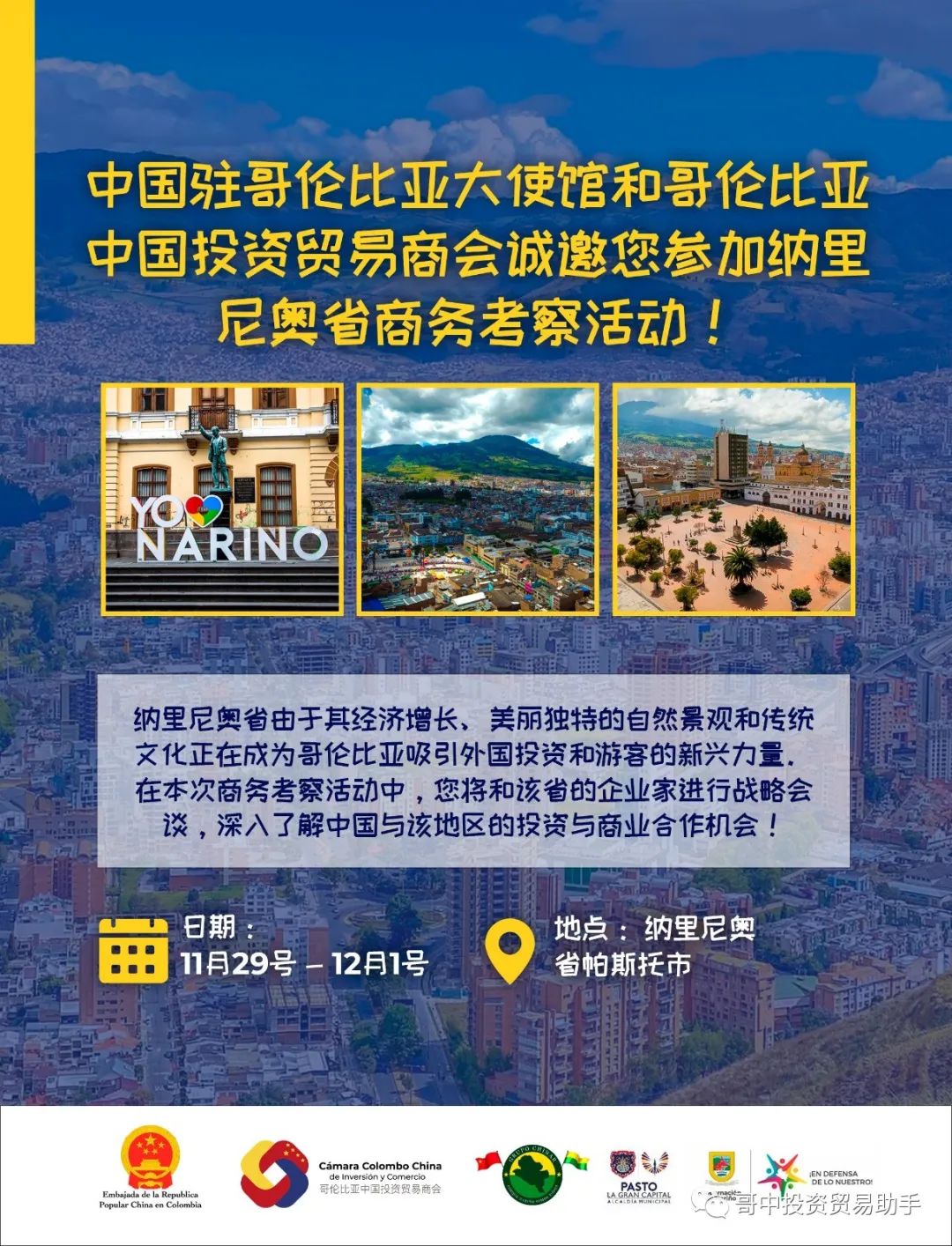 为了进一步加强该省与中国的经贸往来及合作,哥伦比亚中国投资贸易商会携纳里尼奥省省政府、帕斯托市市政府、帕斯托市商会、伊皮亚莱斯市商会、图马科市商会、农业工业保税区、Petronar石油公司、Grupo ChiNar公司、华美国际Pandalatina旅行社以及该省的企业家们诚邀广大中国企业参加2023年11月29日-12月1日的纳里尼奥省商务考察活动,欢迎大家踊跃报名参加。