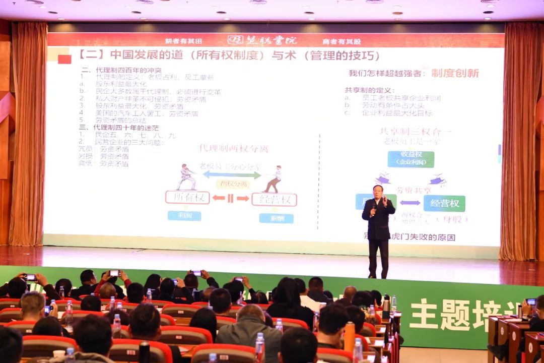会上,郭凡生会长以《“大道至简”——共享制股改的理论与实践》为主题,以深入分析《中共中央国务院关于促进民营经济发展壮大的意见》等国家政策和趋势强调民营企业的机遇和未来;随后以“华为的利润共享制度”为例提出中国发展的道(所有权制度)与术(管理的技巧)的内在逻辑;通过回忆人民公社和包场到户老牛、农民与土地的故事,说明只有先解决想要干,才谈得上怎么干;并以自己企业—慧聪国际以及多年辅导企业案例的产权革命为例,解析民营企业发展的内在逻辑(主要是由商业模式、商业成本与商业制度三方面的关系来体现。)