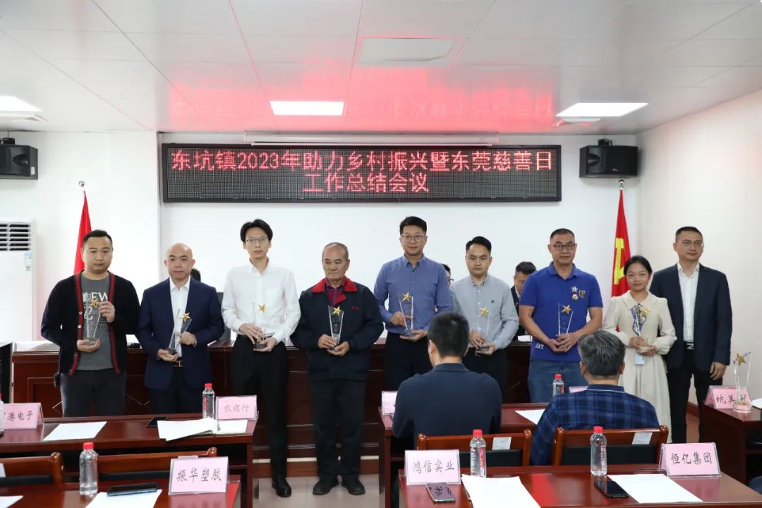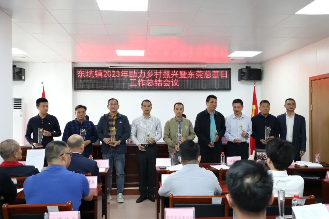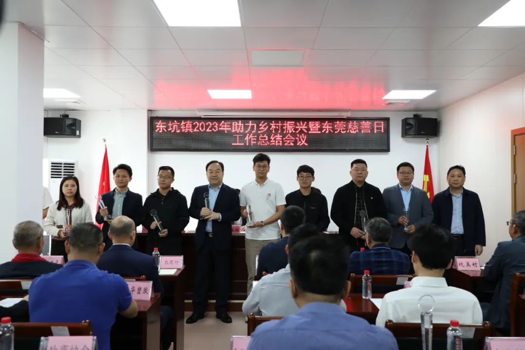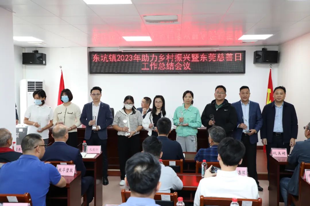 会上,首先由卢荏权组长向与会人员汇报了东坑镇2023年助力乡村振兴暨东莞慈善日工作总结。李达盛主任代表收捐地区向民营企业家在助力乡村振兴暨东莞慈善日所作出的贡献表示衷心的感谢,现场向获得表彰的企业颁发了奖牌和奖杯。东坑镇工商联(商会)荣获“2023年对外扶贫暨东莞慈善日贡献奖”;东坑镇工商联(商会)会员企业:广东恒亿集团有限公司、广东恒丰投资集团有限、东莞市鸿信实业有限公司、东莞市振华塑胶有限公司、广东尚恒能源发展有限公司、东莞市仁峰实业投资有限公司、广东康德威电气股份有限公司、东莞国丰家具有限公司、东莞市顺裕实业投资有限公司、广东爱玛车业科技有限公司、东莞市华舜实业投资有限公司、广东中德电缆有限公司、迈思普电子股份有限公司、东莞市永峰建设工程有限公司、广东宾豪科技股份有限公司等企业荣获表彰。
