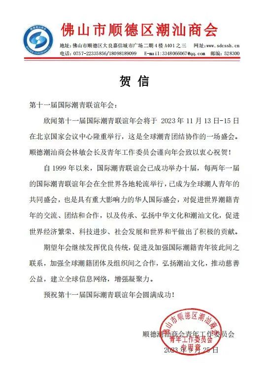 商会潮青成员代表以<视频录制>形式祝贺第十一届国际潮青联谊年会顺利召开。第十一届国际潮青联谊年会坚持“联谊、传承、创新,共创美好未来”的贺信理念,以“新时代、新征程、新潮青、新发展”为主题,通过一场在京盛会,潮青、侨青两翼扩展,文化、科技、创新三重汇聚,全方位地呈现当代潮青和侨青的新思想、新作为与新抱负。