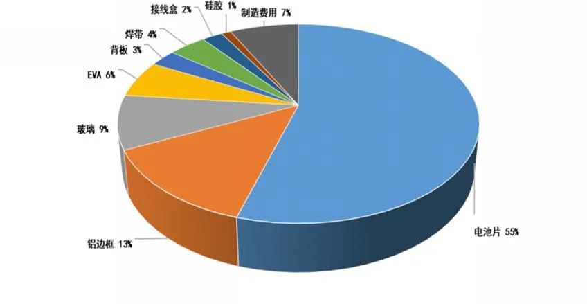 目前清洁能源主要有风能、太阳能、地热能、水能等。其中,太阳能作为新能源,得到国家的大力推广,大型光伏发电站也呈现出增长态势。2022年全球太阳能市场规模约230GW,其中中国新增光伏并网装机容量达到87.41GW,行业总产值突破1.4万亿元人民币。光伏边框是组件的重要组成部分,是主要用于固定、密封光伏组件的框架结构材料,对组件寿命影响较大,耐候性要求较高。按材料划分,光伏边框可分为铝合金边框、钢边框、复合材料边框,其中铝合金边框使用广泛,目前渗透率达到95%以上。此外,光伏边框属于价值较高的组件辅材,在光伏组件成本结构中,电池片成本占据比例约55%,以目前通用的铝边框尺寸及重量来看,光伏边框占比在13%左右(图1),高于EVA、玻璃、背板、焊带等其他辅材,是成本占比最高的辅材。