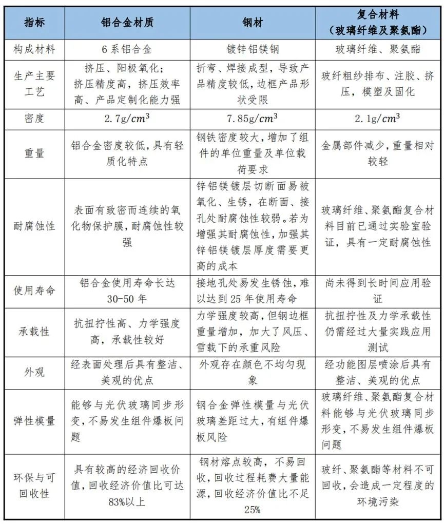 在中国光伏行业发展之初,铝合金依靠重量轻、耐腐蚀性强、成型容易等特点成为主要组件边框材料。但近年来,随着光伏组件应用场景越来越广,组件需面临的极端环境越来越多,对组件边框技术和材料的优化和变革也势在必行,衍生出了无框双玻组件、钢结构边框、橡胶边框、复合材料边框等多种边框替代方案。