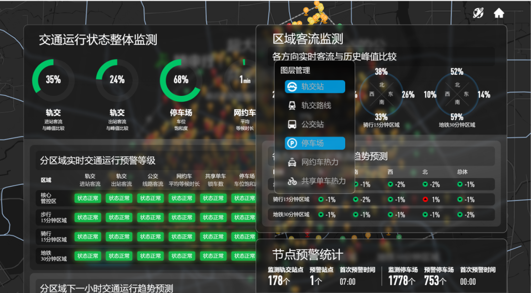 而且,通过动态的区域交通流控大屏,实时区域客流监测、交通运行状态整体监测等,形成更加准确的数据链路,为趋势研判、信息调度、综合指挥、应急处置工作等提供数据支撑,前瞻进行流控预警,有效解决节假日出行、大型公共活动、景区交通保障等面临的交通问题,提升城市的运载能力,全力保障城市正常运行。