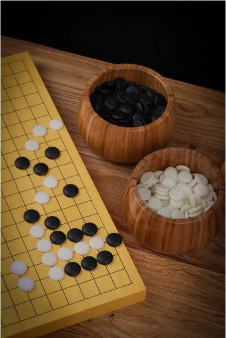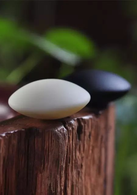 棋子放置于棋盘上,色泽润柔,不眩目刺眼,黑如墨,白如玉。黑子对光照视,宛如一颗墨翠,边闪翠环,乃围棋殿堂上的璀璨明珠;而白子对光细看晶莹如脂,莹润细腻甲于天下。