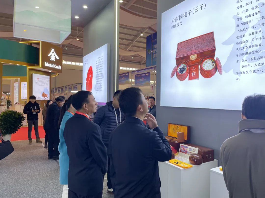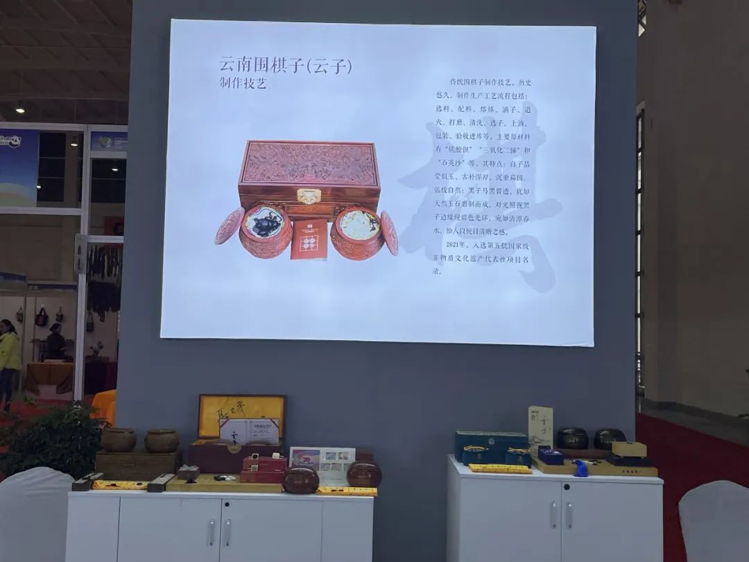 滇池国际会展中心主会场的9号馆为非物质文化遗产和旅游消费馆,本展馆设置了不同元素的展区,如金属,布,陶,石等作为主题展区,云子围棋作为国家级非遗项目,传统制作工艺是用天然矿石熔制,将在“石主题”展区进行为期3天的展览。