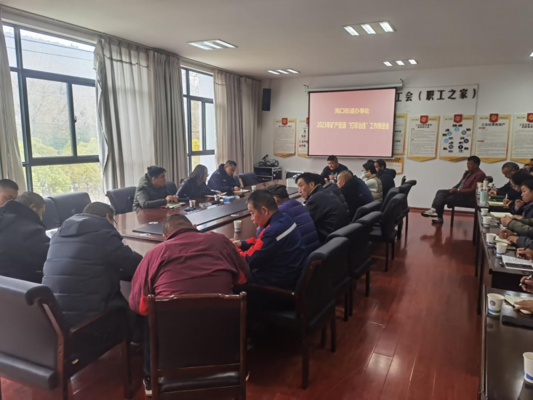 近期,矿产资源私挖盗采现象有所抬头,开展矿产资源“打非治违”专项行动是当前省、市安全生产形势的一项重要工作部署。为加快推进海口街道矿产资源“打非治违”工作,提高海口街道安全防范意识,2023年11月17日上午9:30,海口街道办事处组织召开了矿产资源“打非治违”工作推进会。海口街道党工委副书记、政法委员郭明,街道办事处副主任陈曦,海口司法所、海口自然资源管理所、海口派出所、海口生态文明建设综合巡查队,街道社会治安综合治理中心、城市管理综合服务中心、农林水与应急服务中心、执法中队等相关部门负责人,11家社区及重点涉矿居民小组分管领导,海口林场、海口磷矿、尖山磷矿、西山区兴禹水公司负责人参加会议。