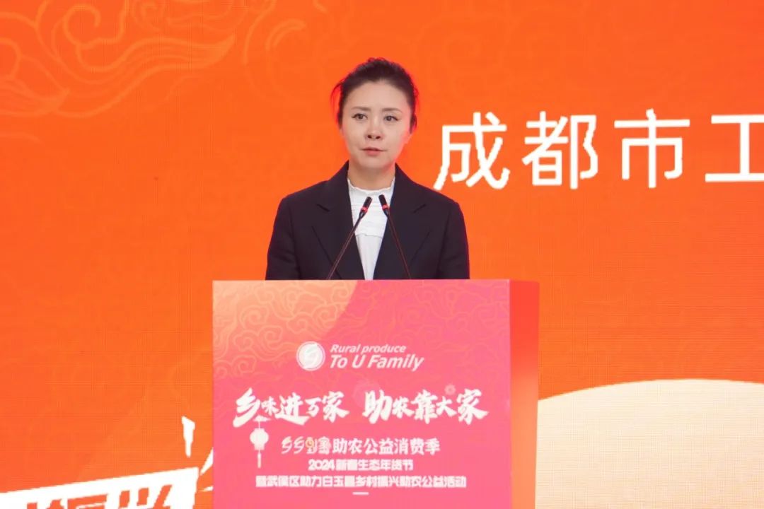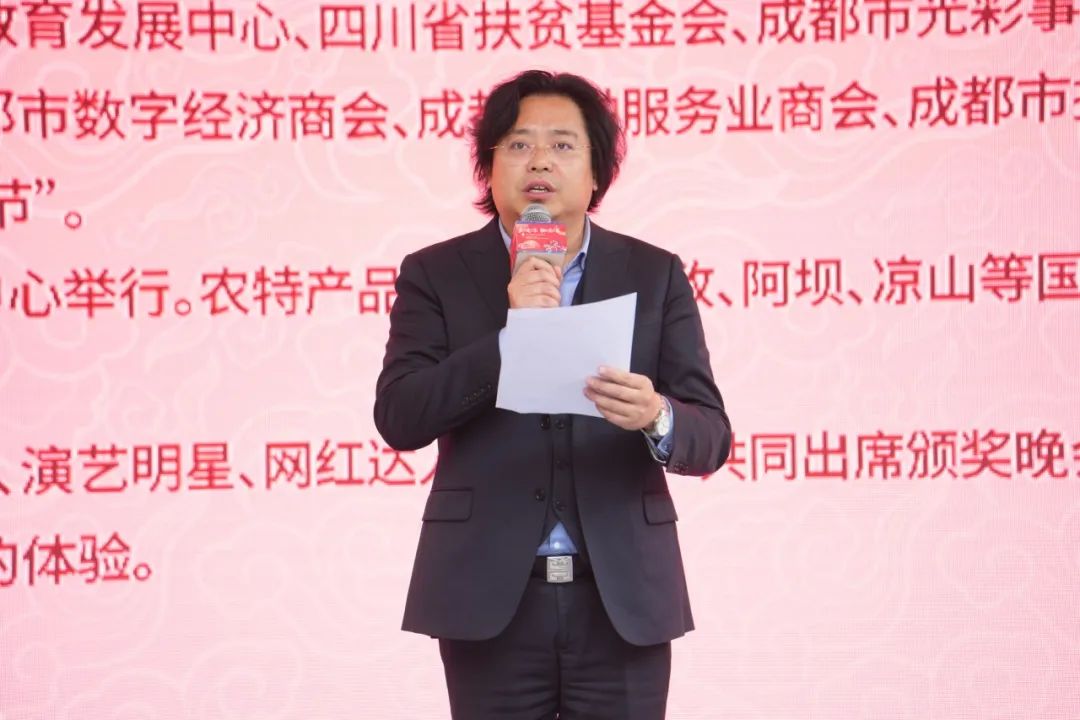 成都文化旅游产业商会会长王开昕在活动现场宣读乡乡到家助农公益消费季倡议书,倡议大家以购代捐,积极参与万企兴万村活动,携手助力四川乡村振兴工作迈向新台阶。