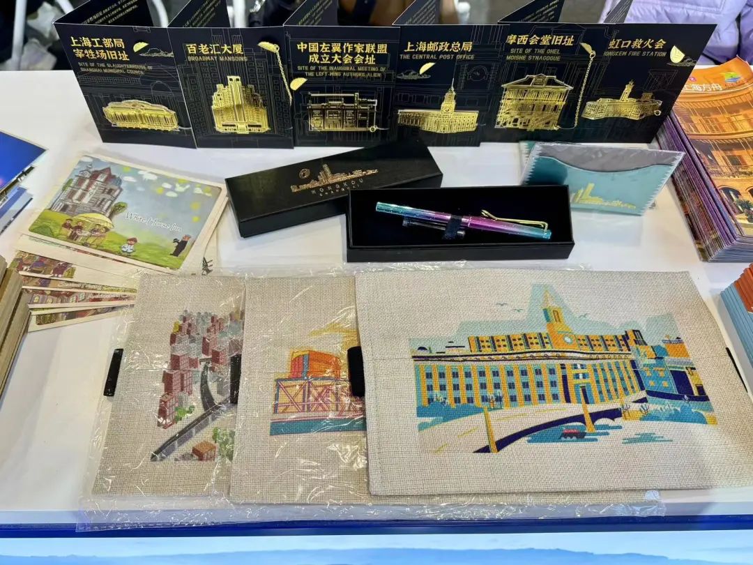 优秀历史建筑金属书签、虹口地标景点车载纸巾套、地标建筑外观刺绣卡包等精美的文创产品,是虹口展位的另一大亮点,广受业内人士和游客喜爱。
