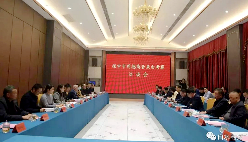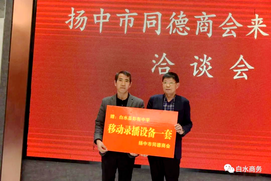 考察期间召开了扬中市同德商会来白水考察洽谈会,杨友军主持洽谈会,刘亚平代表县委、县政府对商会代表团的到来表示热烈欢迎,对长期以来关心支持白水发展的各位企业家表示衷心感谢。高新区管委会主任石红斌就全县经济社会发展状况、特色产业、重点项目等情况进行了介绍。座谈会上播放观看了白水宣传片,从全方位、多方面的了解了白水的风土人情和特色产业。同德商会会长张孝阳向大家介绍了商会基本情况,并为我县彭衙中学捐赠移动录播设备一套。双方还进行广泛深入交流。