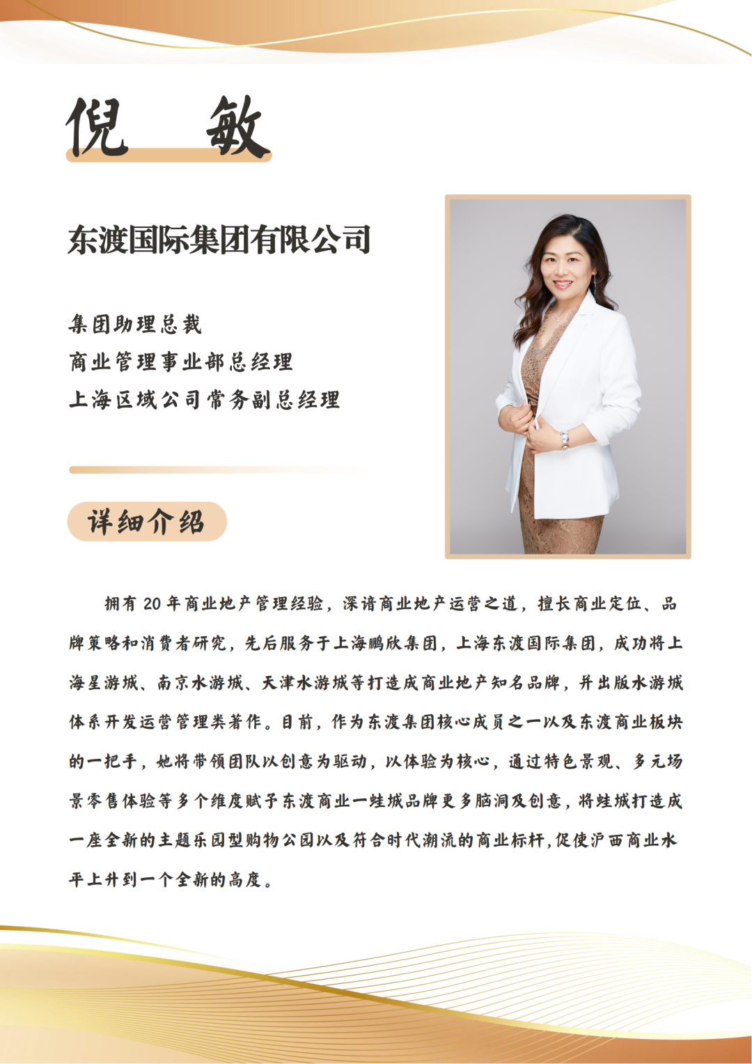 拥有 20 年商业地产管理经验,深谙商业地产运营之道,擅长商业定位、品牌策略和消费者研究,先后服务于上海鹏欣集团,上海东渡国际集团,成功将上海星游城、南京水游城、天津水游城等打造成商业地产知名品牌,并出版水游城体系开发运营管理类著作。目前,作为东渡集团核心成员之一以及东渡商业板块的一把手,她将带领团队以创意为驱动,以体验为核心,通过特色景观、多元场景零售体验等多个维度赋予东渡商业一蛙城品牌更多脑洞及创意,将蛙城打造成一座全新的主题乐园型购物公园以及符合时代潮流的商业标杆,促使沪西商业水平上升到一个全新的高度