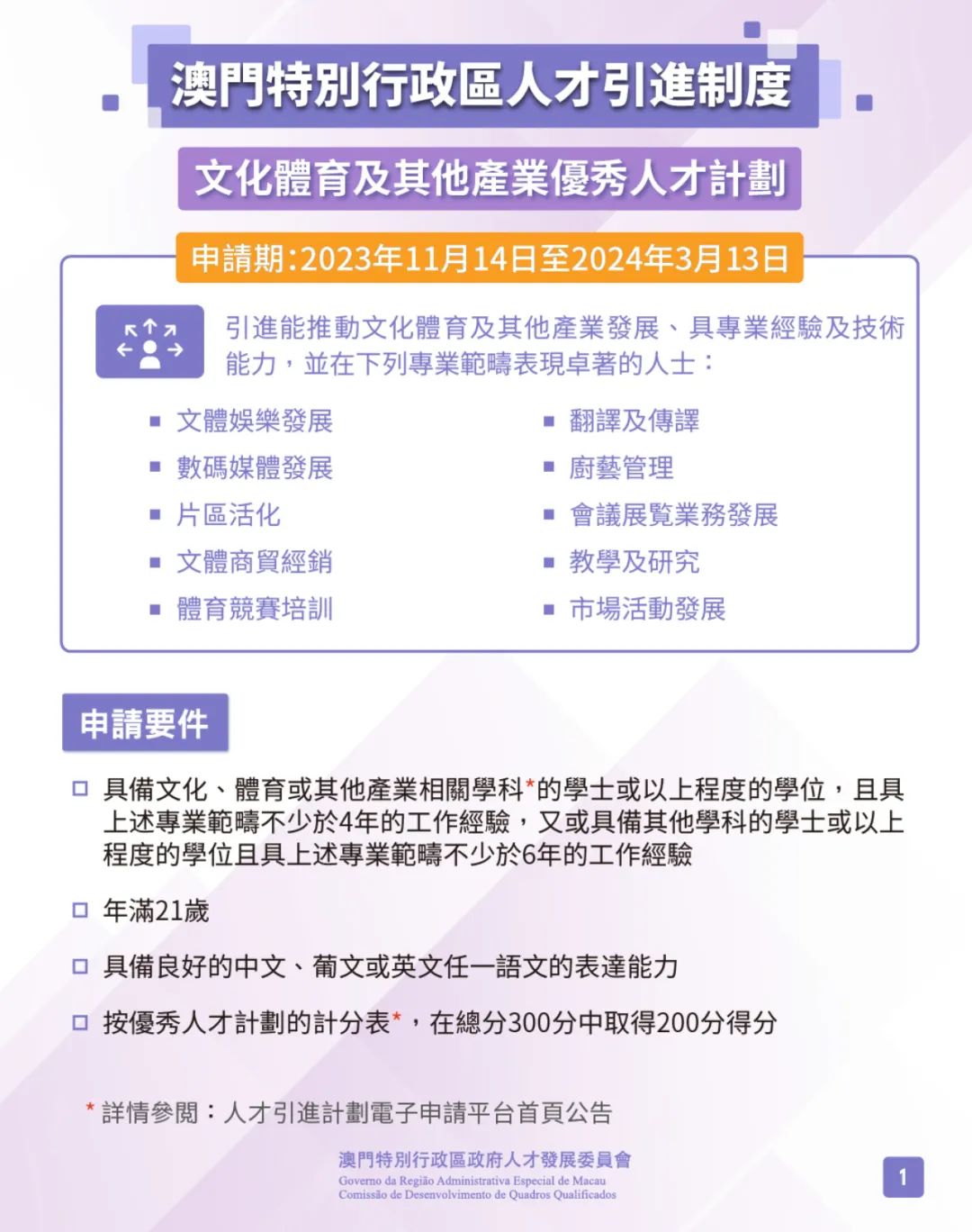 文化體育及其他產業優秀人才計劃的申請期為2023年11月14日至2024年3月13日。計劃旨在引進能推動文化體育及其他產業發展、具專業經驗及技術能力,並在下列專業範疇表現卓著的人士:(一)文體娛樂發展;(二) 數碼媒體發展;(三)片區活化;(四)文體商貿經銷;(五)體育競賽培訓;(六)翻譯及傳譯;(七)廚藝管理;(八)會議展覧業務發展;(九)教學及研究;(十)市場活動發展。