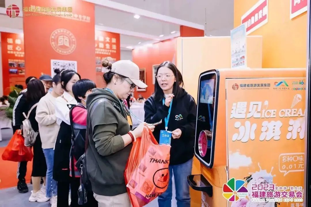 线下展会现场,文旅产品、线路热卖,并设置一体立屏机、自助售货机、网红冰淇淋机等网红打卡,吸引大批市民沉浸式体验福建数字文旅“黑科技”。