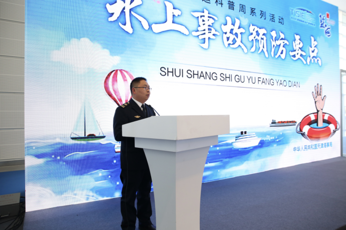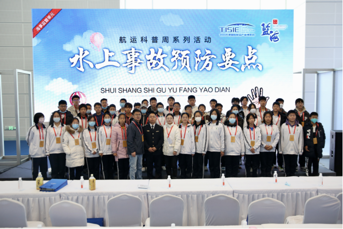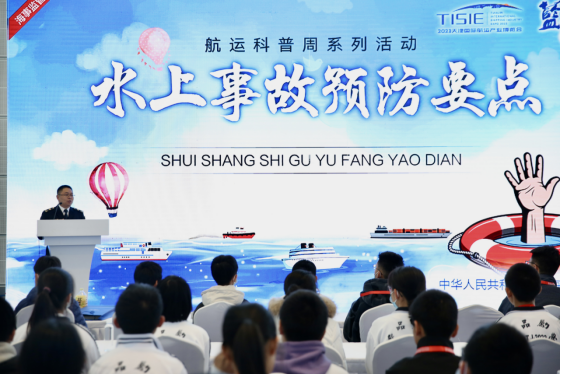 11月18日,2023天津国际航运产业博览会(以下简称:天津国际航运展)依旧热度不减,天津国际航运展组委会邀请到新港海事局指挥中心主任、海事调查官刘长军老师专程来到展会现场,为津南区咸水沽四中的师生专题讲述水上事故的相关知识要点,并亲自作示范。
