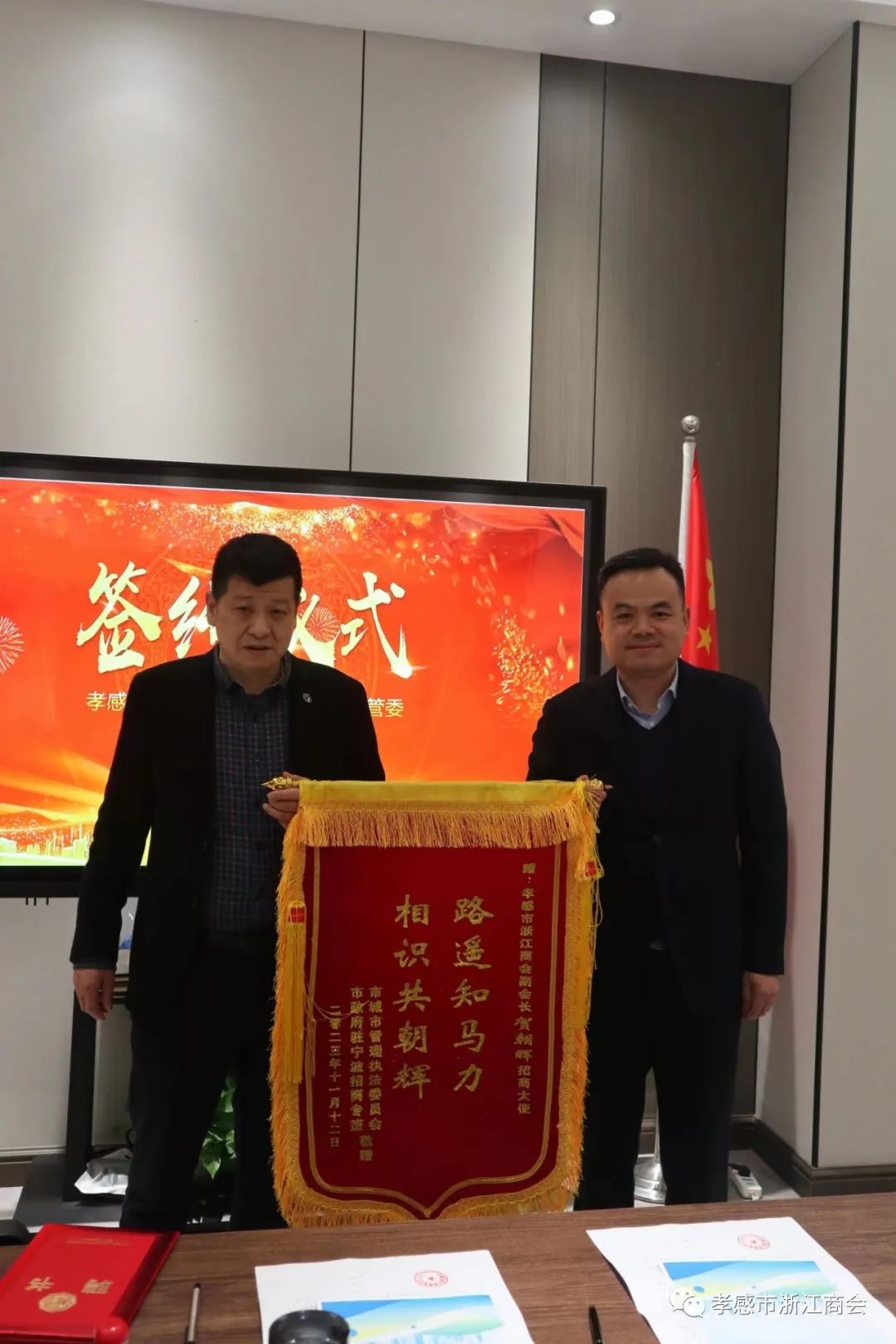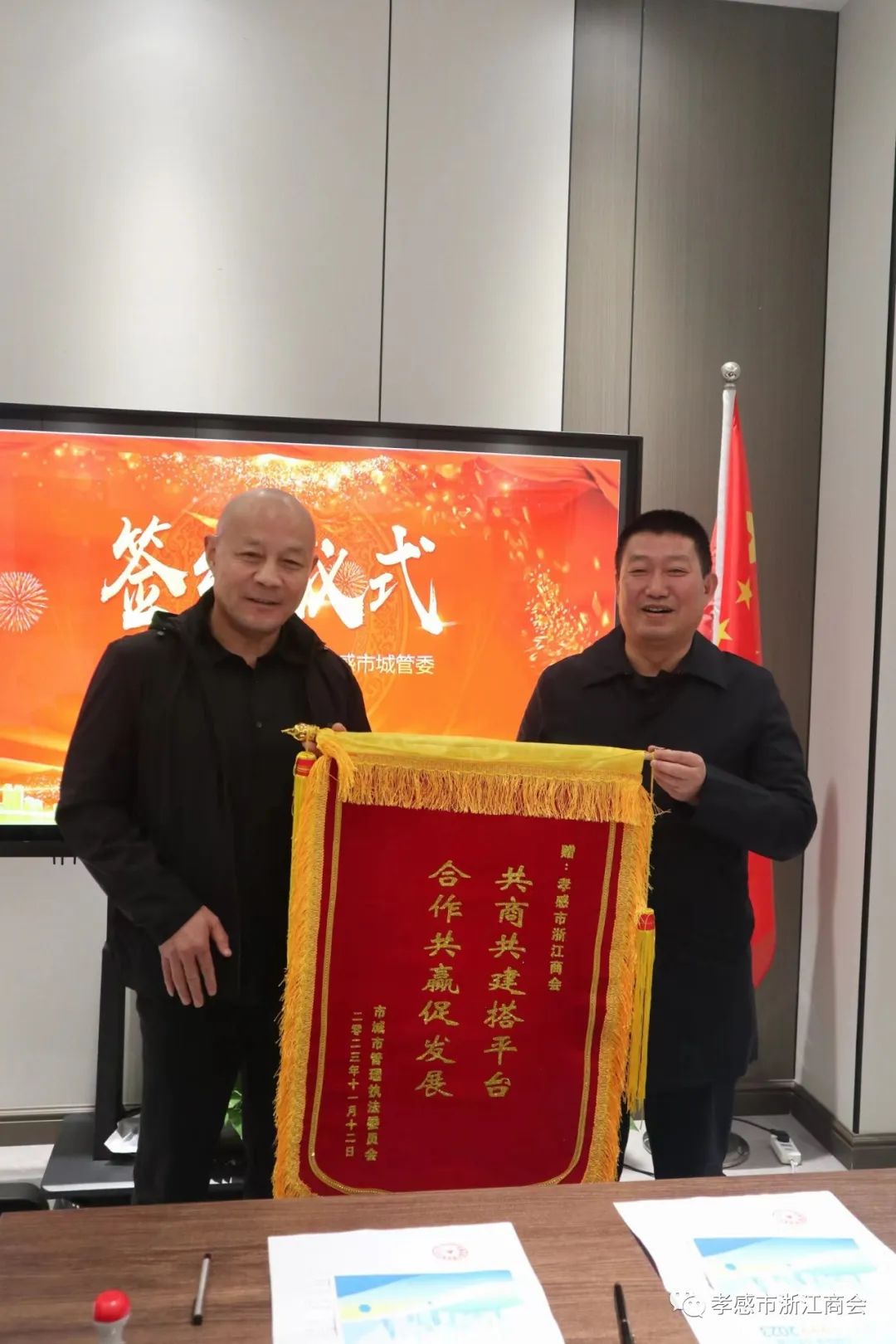 市城管委为我会及副会长贺朝辉赠送锦旗,对商会一直以来对政府各项政策大力支持表示诚挚的感谢。希望以后能与我会进一步完善长期有效连接机制,推动招商引资工作再上新的台阶。我会将围绕会员企业自身特色、未来投资方向、孝感重点产业作相关推介,进一步加强孝浙两地资源、人才、产业方面互联互动,争做城市发展“合伙人”。