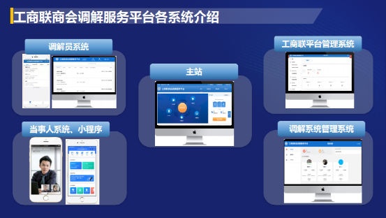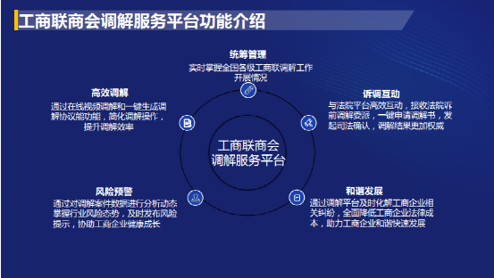 为贯彻落实最高人民法院、全国工商联《关于发挥商会调解优势,推动民营经济领域纠纷多元化解机制建设的意见》,加强商会调解信息化建设,服务保障民营经济健康发展,全国工商联、最高人民法院共同开发了“工商联商会调解服务平台”。该平台是商会调解组织开展线上线下调解的应用保障系统,是工商联推进商会调解组织建设的服务管理系统,是全国工商联与最高人民法院“总对总”调解合作,地方工商联、商会调解组织与人民法院工作对接、诉调衔接的技术支持系统。