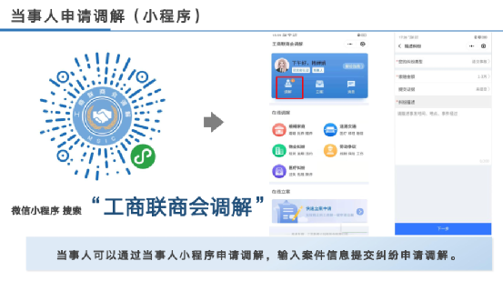 平台配套开发了商会调解APP、微信小程序。当事人可以在线咨询、在线评估、在线提请调解,符合一定条件的可以在线申请人民法院立案、在线申请司法确认。