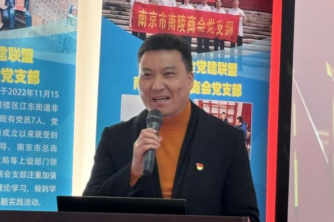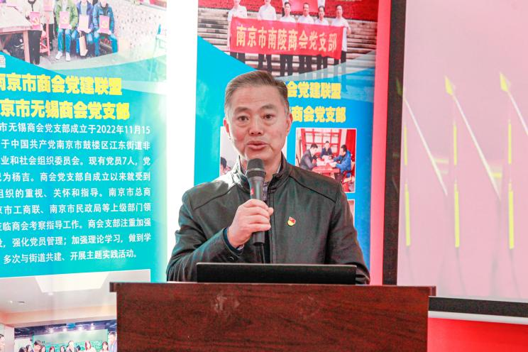 商会党建联盟首届轮值执行长、泰兴商会党支部书记、南京御龙航空科技有限公司总经理丁剑峰介绍8家发起成立商会党建联盟党组织情况,并对党建联盟如何充分发挥聚宝山活动中心作用的工作打算进行了说明。