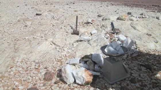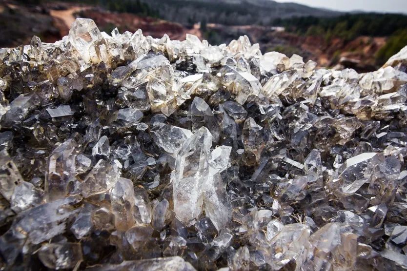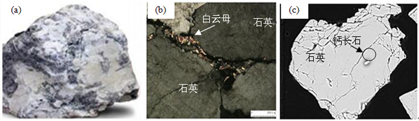 图1 (a) 美国Spruce Pine 地区花岗伟晶岩岩石形貌图,(b) 青海某脉石英显微形貌图,(c) 某脉石英经选矿提纯—焙烧水淬—混合酸浸后石英中矿物包裹体剖面形貌图